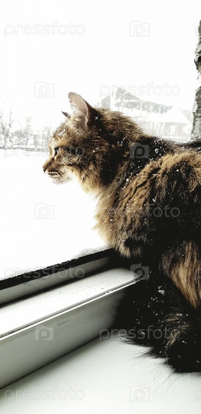 Кошачье чудо на фоне зимнего пейзажа, когда за уютным окном тихо падает снег в безмятежный момент созерцания