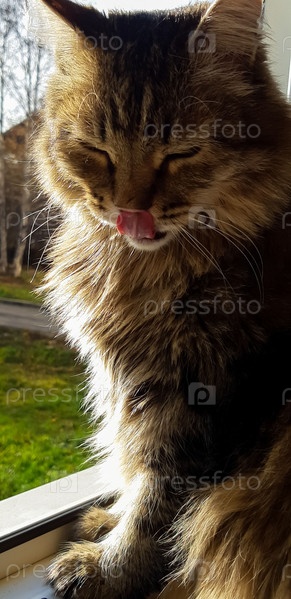 Величественная кошка наслаждается теплым солнцем у окна, игриво облизывая свои усы в спокойной зеленой обстановке заднего двора