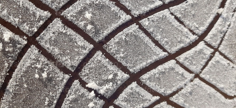 Узоры текстуры и устойчивости, продемонстрированные в сложном рисунке протектора шины, отмеченного инеем на зимнем пейзаже
