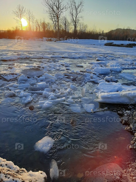 Закат над частично замерзшей рекой создает безмятежный зимний пейзаж с тающим льдом и зеркальной водой в сумерках
