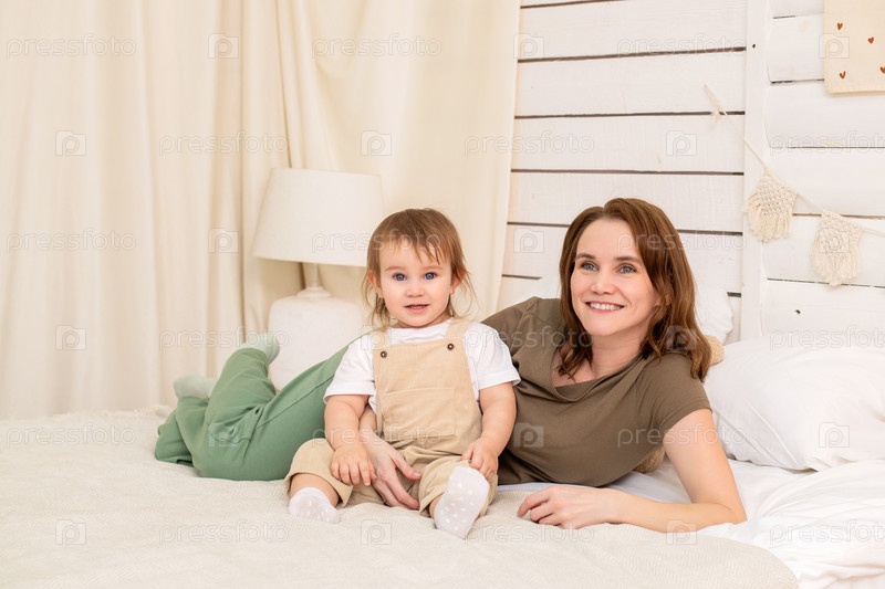 Веселый малыш играет на уютной кровати с любящей мамой. Гармоничное развитие и забота в атмосфере дома и семьи
