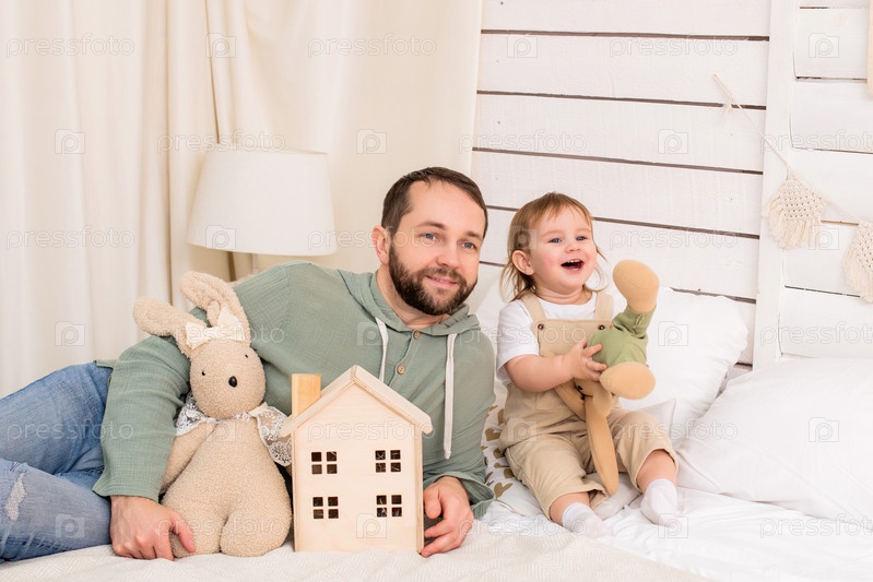 Малыш играет на уютной кровати с папой. Гармоничное развитие и обучающие игры в атмосфере дома