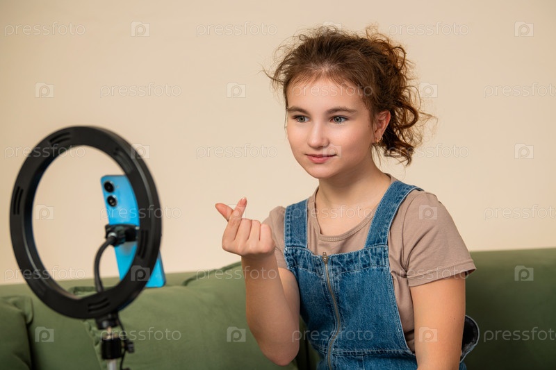 Молодая женщина-блогер сидит на диване и смотрит на телефон, прикрепленный к кольцевой лампе. Сцена запечатлела дружелюбное и позитивное онлайн-взаимодействие