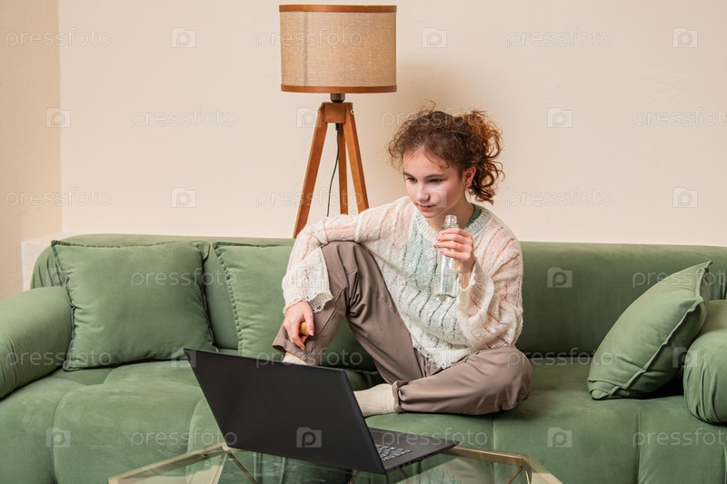 Молодая девушка внимательно смотрит на ноутбук, сидя на зеленом диване, держа бутылку воды. Она выглядит расслабленной и сосредоточенной в уютной домашней обстановке