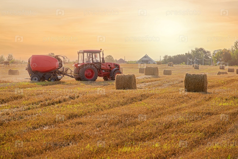 Красный трактор, работающий на огромном поле во время заката, окруженный многочисленными тюками сена. Техника активна, подчеркивая сельскохозяйственную производительность и сельскую красоту в золотой час