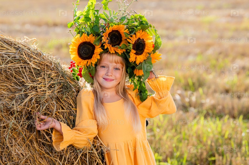 Молодая девушка в ярком венке из подсолнухов и желтом платье прислонилась к стогу сена на залитом солнцем поле. Праздник урожая