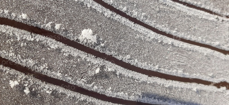 Узоры текстуры и устойчивости, продемонстрированные в сложном рисунке протектора шины, отмеченного инеем на зимнем пейзаже