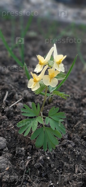 Яркие желтые цветы цветут среди пышной зеленой листвы в живописном городском пейзаже в первые дни весны. Хохлатка