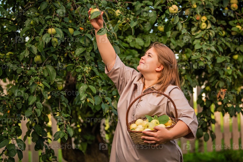 Женщина собирает спелые яблоки с дерева в пышном летнем саду. Она держит плетеную корзину, наполненную свежесобранными фруктами, наслаждаясь мирной обстановкой на открытом воздухе