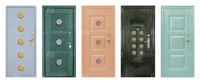Набор моделей входных металлических дверей, изолированных на белом фоне