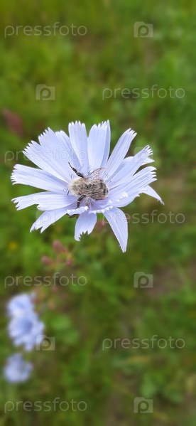 Нежный голубой цветок цикория приютил пчелу посреди яркого зеленого луга в полдень