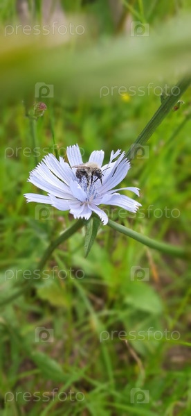 Нежный голубой цветок цикория приютил пчелу посреди яркого зеленого луга в полдень