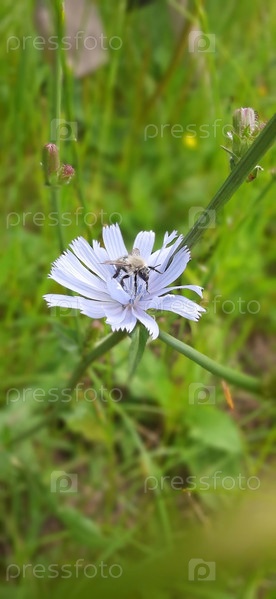Нежный голубой цветок цикория приютил пчелу посреди яркого зеленого луга в полдень