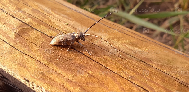 Замысловатый жук исследует деревянную поверхность, освещенную солнечным светом, в мирный полдень на открытом воздухе с пышной растительностью