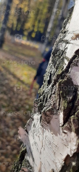 Красивые осенние цвета окружают текстурированный ствол березы среди золотистых листьев в тихом лесном уголке во второй половине дня