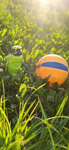 Летний пикник с разноцветным мячом и бутылкой освежающей воды на сочной зеленой траве