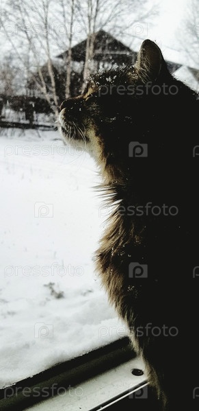 Кошачье размышление о снежном зимнем дне через окно уютной хижины в лесу