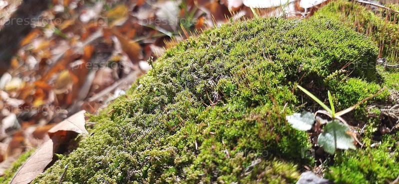 Покрытый мхом камень, расположившийся среди опавших листьев в тихом лесу в яркий солнечный день