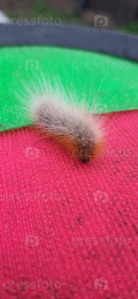 Захватывающий крупный план пушистой гусеницы, отдыхающей на яркой ткани под ярким естественным светом в оживленной обстановке на открытом воздухе