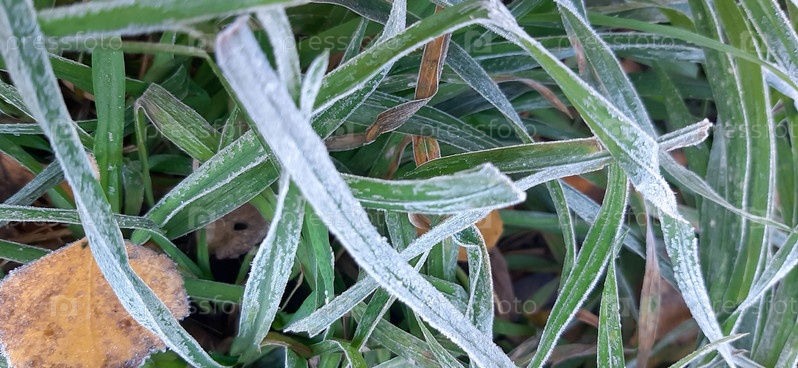 Морозное утро придает волшебный оттенок яркой зеленой траве ранней осени, создавая захватывающий контраст и безмятежную атмосферу