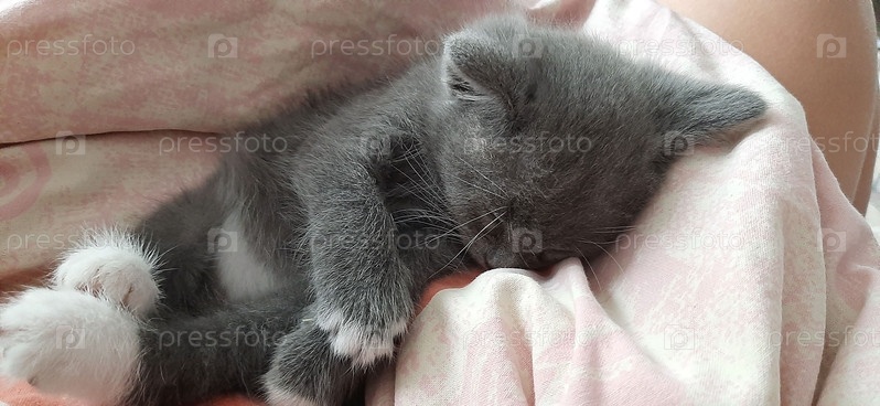 Мягкий серый котенок мирно дремлет в уютной обстановке, окруженный теплыми цветами и приятными текстурами, запечатлевая момент спокойствия и умиления
