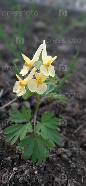 Яркие желтые цветы цветут среди пышной зеленой листвы в живописном городском пейзаже в первые дни весны. Хохлатка