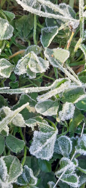 Покрытые инеем клеверы блестят в лучах раннего утра, запечатлевая безмятежный момент в объятиях природы