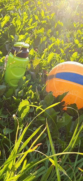 Летний пикник с разноцветным мячом и бутылкой освежающей воды на сочной зеленой траве