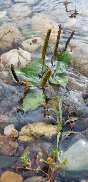 Водные растения процветают среди гальки в спокойном ручье под теплыми солнечными лучами, отражающимися от спокойных вод