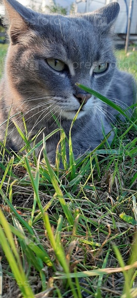 Серый кот отдыхает на травянистом лугу под теплыми солнечными лучами безмятежного дня