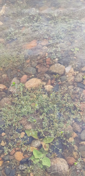 Чистая вода, открывающая мозаику камней и зелени в тихом месте на берегу реки в тихий полдень