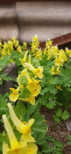 Яркие желтые цветы цветут среди пышной зеленой листвы в живописном городском пейзаже в первые дни весны. Хохлатка
