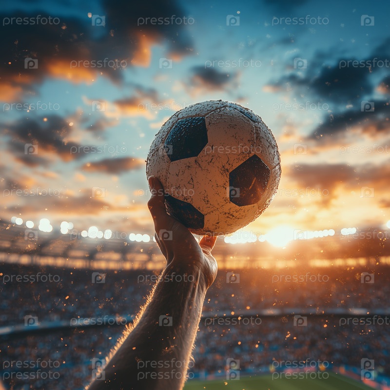 Рука держит футбольный мяч на переполненном стадионе
