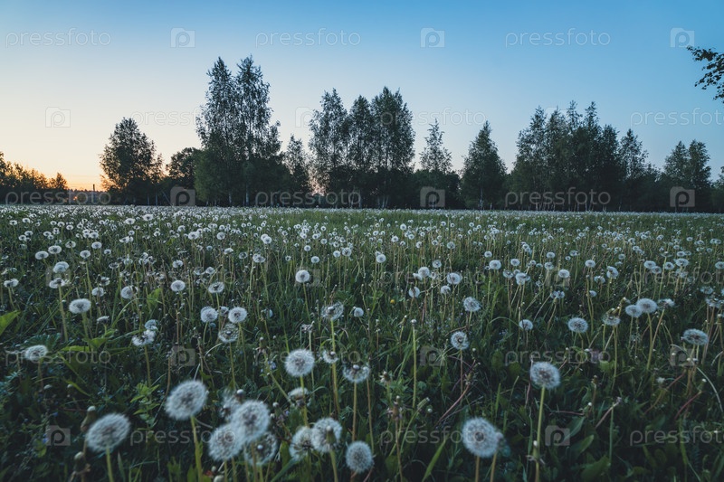 Поле одуванчиков в сумерках с деревьями на горизонте