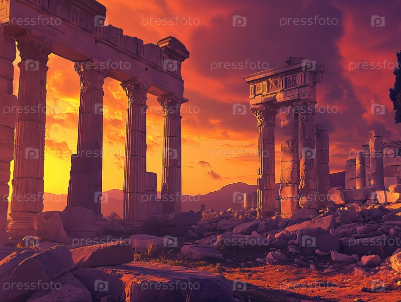 Древние руины с возвышающимися колоннами на закате