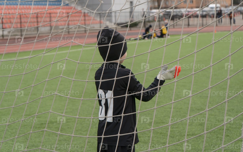 Неузнаваемый молодой вратарь ждет гол на футбольном поле