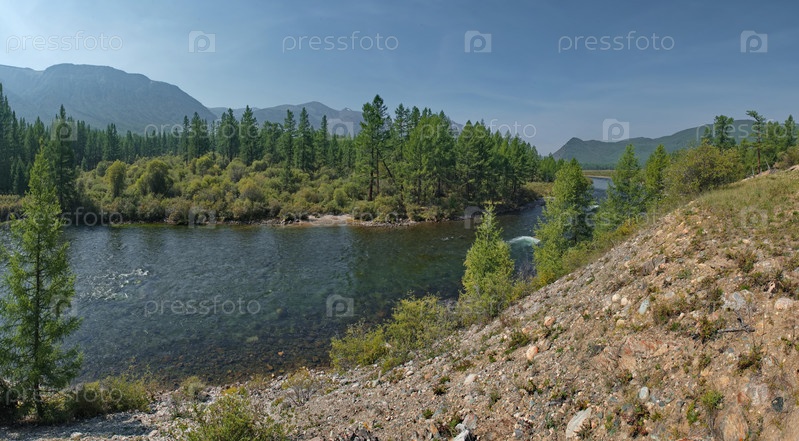 Россия, Республика Бурятия. Панорамный вид горной реки Тисса между живописными горами в районе пика Топографов