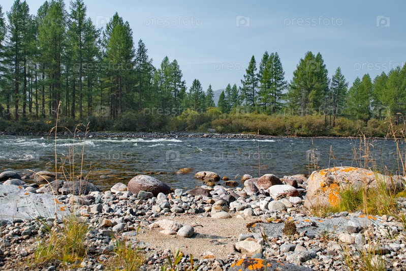 Россия, Республика Бурятия. Панорамный вид горной реки Тисса между живописными горами в районе пика Топографов