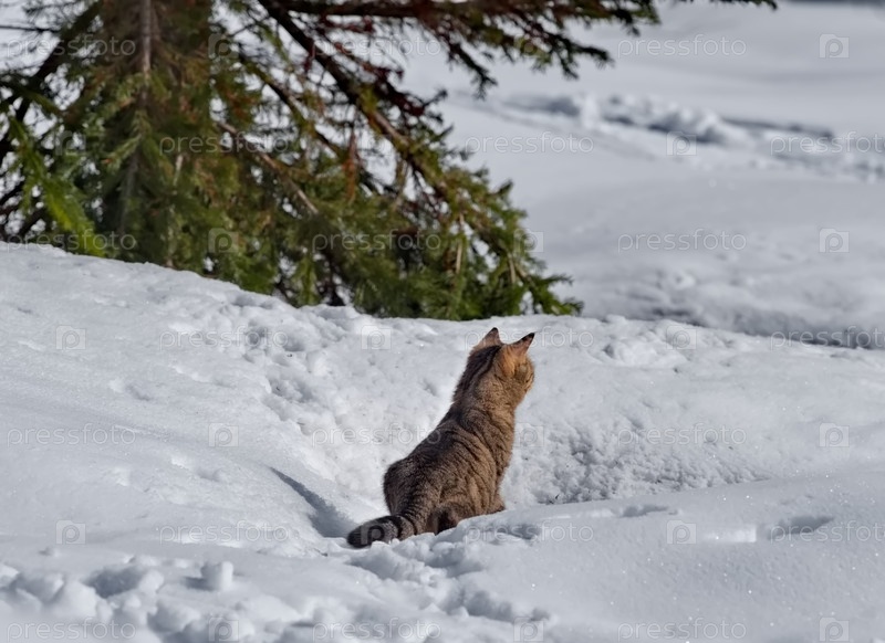 Россия, Кузнецкий Алатау. Молодая кошка тигрового окраса вслушивается в тишину леса на весеннем снегу
