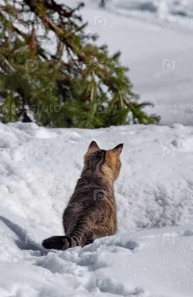 Россия, Кузнецкий Алатау. Молодая кошка тигрового окраса вслушивается в тишину леса на весеннем снегу
