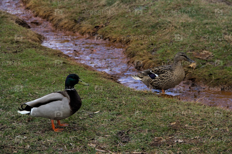 Кряквы гуляют у ручья в Царицыно