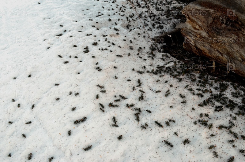 Под елкой хвоинки и остатки шишек на снегу после кормежки лесных птиц