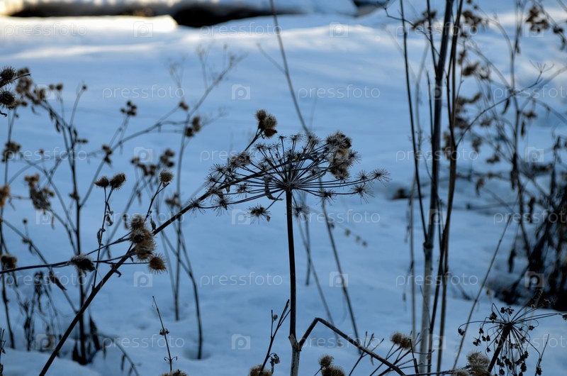 Сорняки на пустыре под снегом