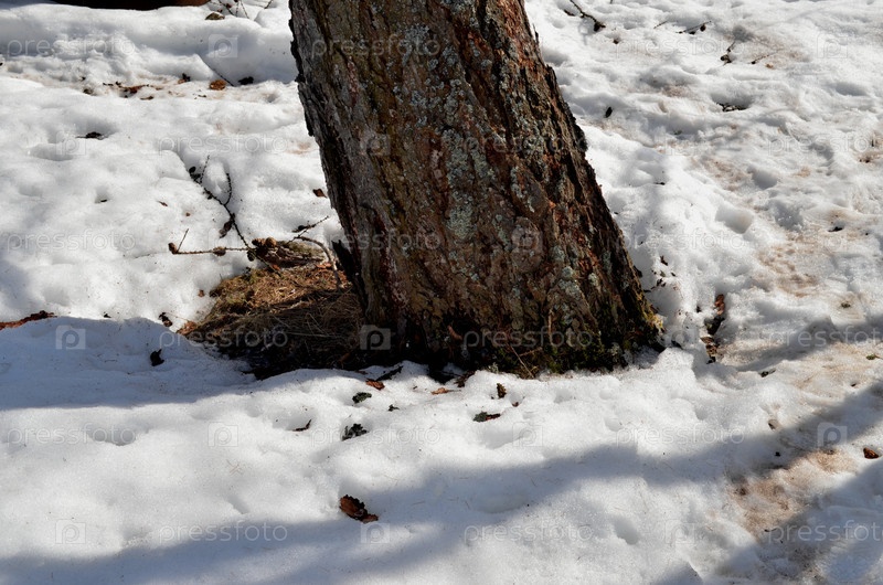 Проталины возле ствола дерева весной