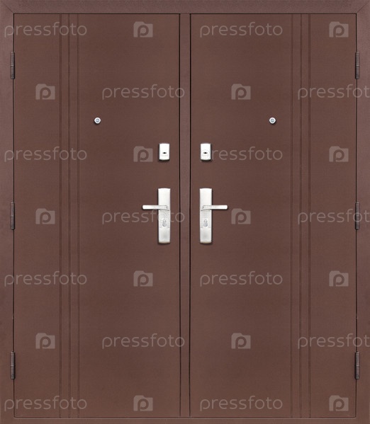 Двустворчатая входная металическая дверь, изолированная на белом фоне
