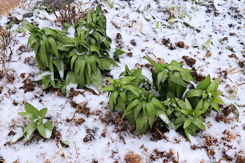 Нежные первые ростки в снегу в весеннем саду. Концепция выживания и прихода весны. Аномальные снегопады в апреле угрожают растениям. Абстрактный цветочный фон, баннер для экрана