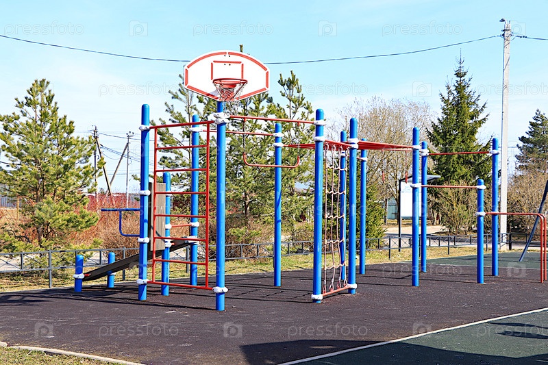 Россия, Санкт-Петербург, 14 апреля 2025 г. Детская площадка с различными игровыми конструкциями в деревне в России, Ленинградская область. Игровые конструкции домов для спортивного развития детей