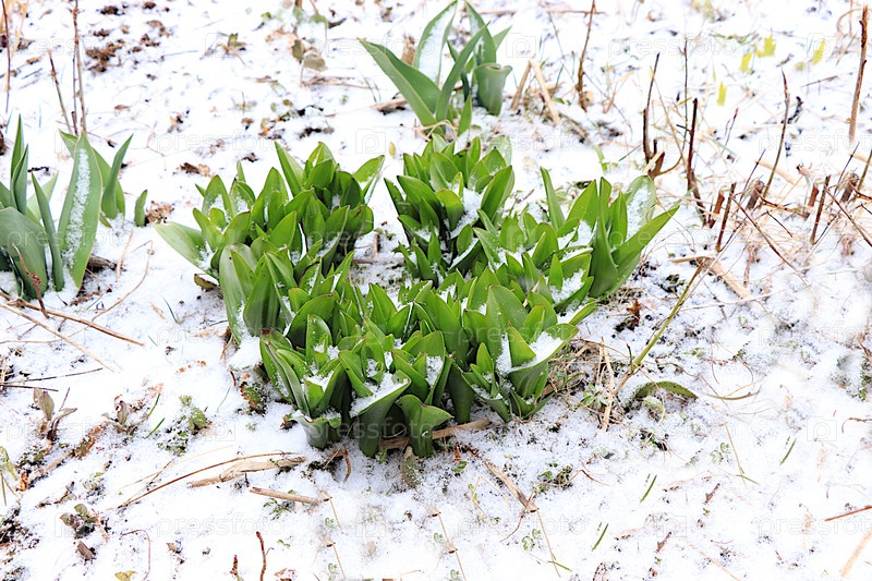 Нежные первые ростки в снегу в весеннем саду. Концепция выживания и прихода весны. Аномальные снегопады в апреле угрожают растениям. Абстрактный цветочный фон, баннер для экрана