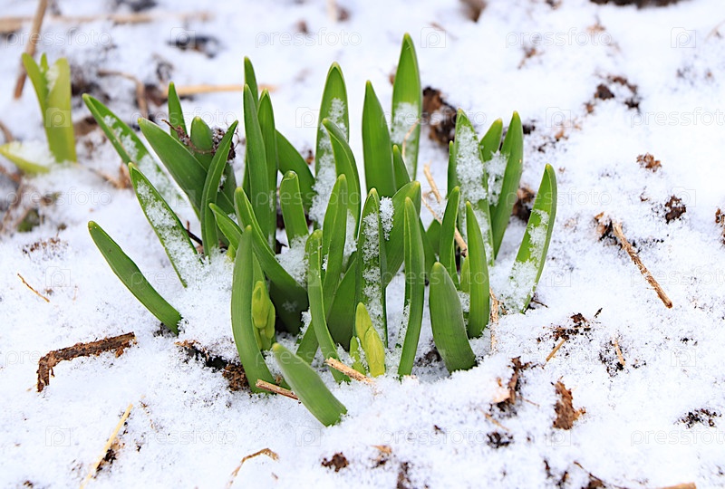 Нежные первые ростки в снегу в весеннем саду. Концепция выживания и прихода весны. Аномальные снегопады в апреле угрожают растениям. Абстрактный цветочный фон, баннер для экрана