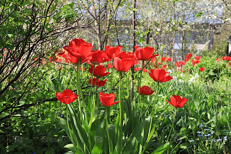 Нежные тюльпаны в саду на рассвете в лучах света, абстрактный цветочный весенний расфокусированный фон в пастельных тонах с мягким фокусом и боке. Красивая открытка или баннер для экрана